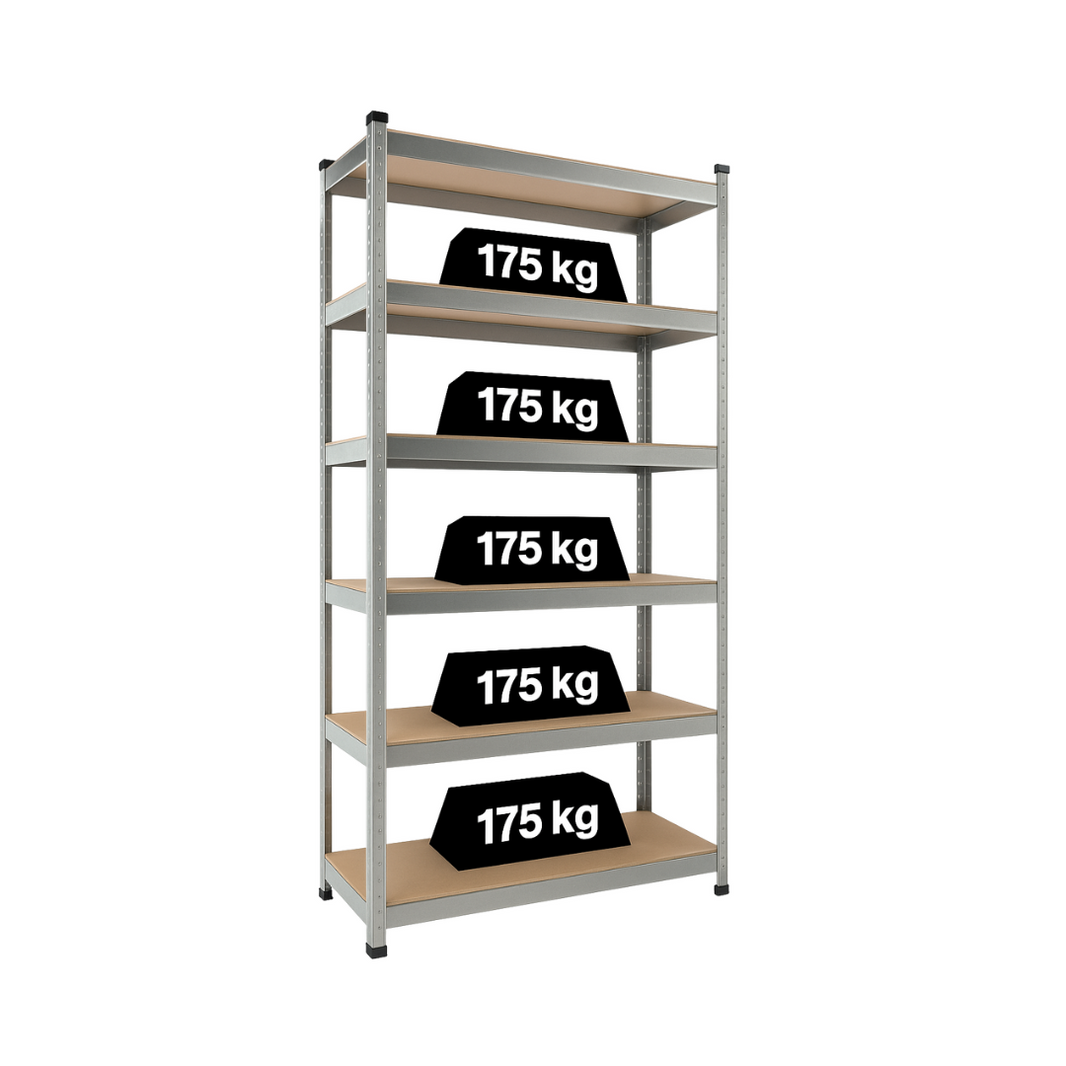 Ogni ripiano può reggere fino a 175 kg, per una portata complessiva di 875 kg. È quindi ideale sia per oggetti pesanti come attrezzi e elettrodomestici, sia per scatole leggere e ingombranti.
