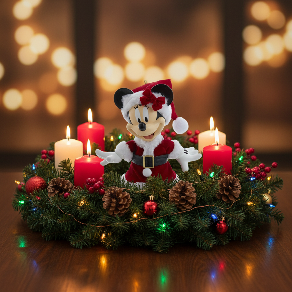 Minnie è raffigurata in un adorabile abito da Babbo Natale, completo di cappuccio bordato in pelliccia bianca, cintura nera e un elegante fiocco rosso che aggiunge un tocco di dolcezza iconica.