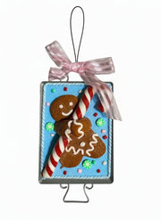 L’ornamento rappresenta una mini teglia dal bordo effetto metallico con sfondo azzurro in stile glassa, impreziosita da un tenero omino di pan di zenzero applicato frontalmente che abbraccia un bastoncino candy cane rosso-bianco. La figura è decorata con piccoli confettini colorati e dettagli dipinti che evocano l’artigianalità dei dolci natalizi.