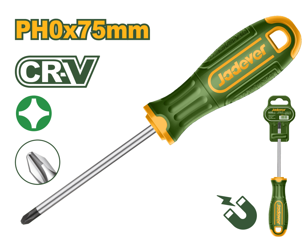 Il cacciavite a croce Phillips PH0 x 75 mm è progettato per garantire precisione, affidabilità e comfort durante l’utilizzo. La lama è realizzata in acciaio Cr-V (cromo-vanadio), materiale noto per l’elevata resistenza all’usura e alla deformazione, con finitura della punta nera per una maggiore protezione dalla corrosione.